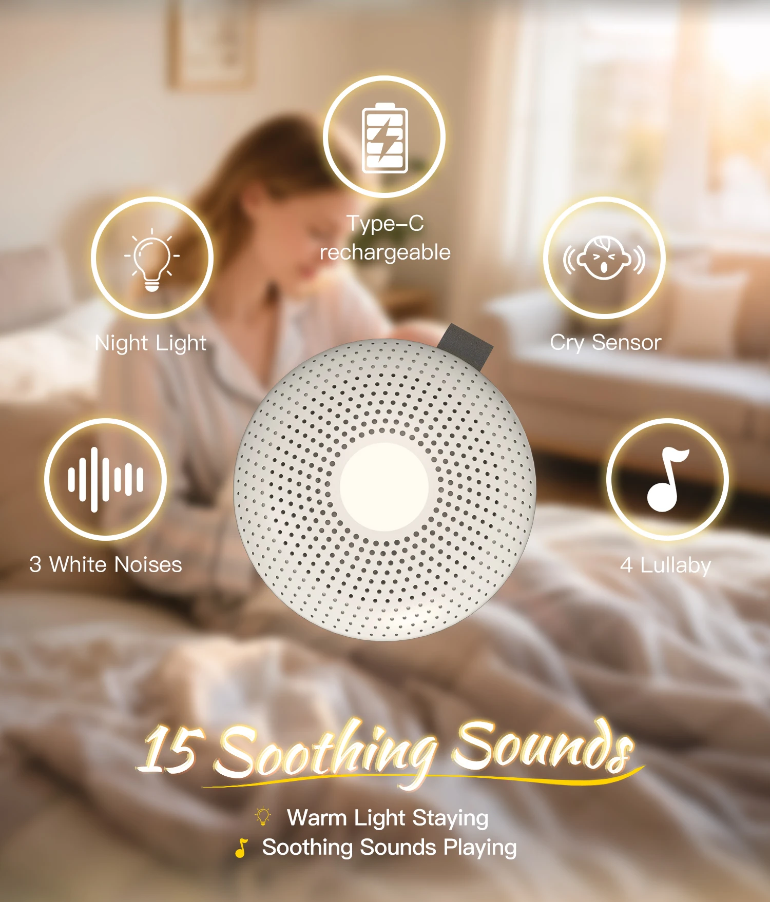 Portable Sleep Aid White Noise Machine for Baby & Adult with 15 Sounds Smart Cry Detection Night Light Timer Newborn Gift